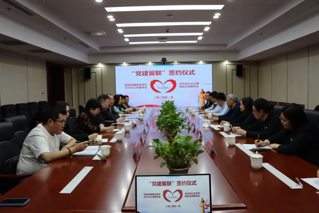 为深入学习贯彻党的二十大精神,进一步加强党建工作向纵深发展,促进党建与业务深度融合,构建资源共享、优势互补、互相促进、共同提高的党建工作新格局,2024年1月23日,中共中国电信呼伦贝尔分公司委员会与中共呼伦贝尔博物院支部委员会隆重举行“党建翼联”签约仪式,开启了下一步党建共建和深度合作的高质量新篇章。