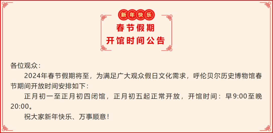 2024年春节假期将至,为满足广大观众假日文化需求,呼伦贝尔历史博物馆春节期间开放时间安排如下: 正月初一至正月初四闭馆,正月初五起正常开放,开馆时间:早9:00至晚20:00。
