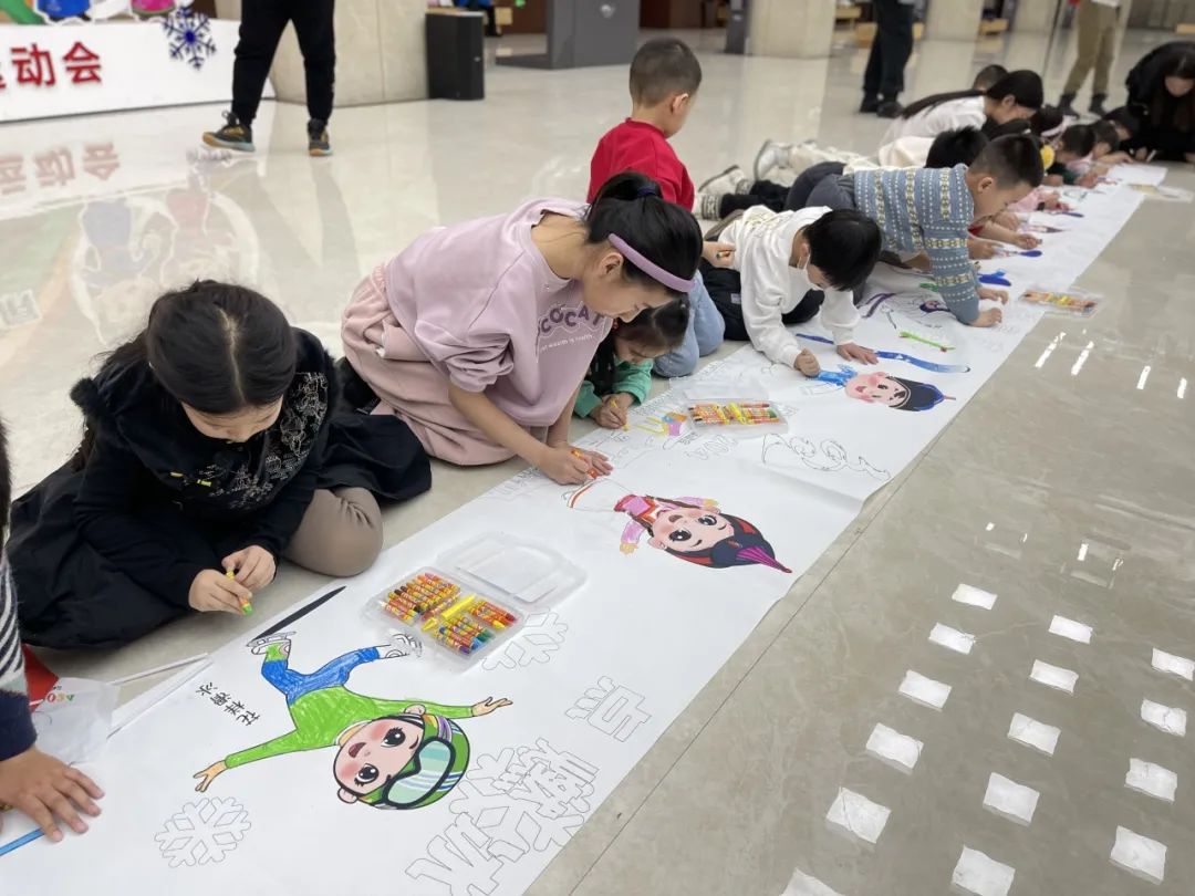 活动第二场,举行有纪念意义的百名儿童绘制长卷活动。四幅长卷内容分别为喜迎“十四冬”打造的冬季运动会比赛项目、龙年中国的关于龙的故事、热爱祖国爱我中华的题材以及铸牢中华民族共同体意识中华民族大团结的内容。首先由社教老师为小朋友们讲述百人长卷绘画内容及题材的内涵。其次进入绘画环节,孩子们在家长和工作人员的协助下一起铺开长卷,拿起画笔,描绘出心目中的作品。