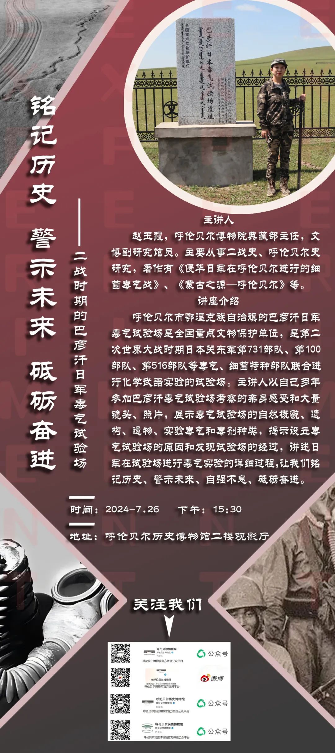 呼伦贝尔市鄂温克族自治旗的巴彦汗日军毒气试验场是全国重点文物保护单位,是第二次世界大战时期日本关东军第731部队、第100部队、第516部队等毒气、细菌特种部队联合进行化学武器实验的试验场。主讲人以自己多年参加巴彦汗毒气试验场考察的亲身感受和大量镜头、照片,展示毒气试验场的自然概貌、遗构、遗物、实验毒气和毒剂种类,揭示设立毒气试验场的原因和发现试验场的经过,讲述日军在试验场进行毒气实验的详细过程,让我们铭记历史、警示未来、自强不息、砥砺奋进。