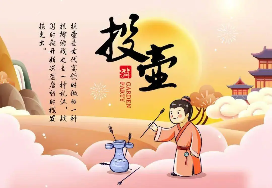 投壶,源于射礼,是中国古代宴饮时做的一种投掷游戏,也是一种礼仪。“暇日宾月集,投壶雅戏同”,元宵节组织投壶活动寓意“投财纳福,所投皆中”。