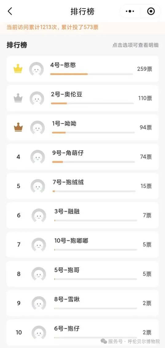 呼伦贝尔博物院 2025年12月31日 15:52 内蒙古 经过公平公正的投票统计与严格核验,呼伦贝尔博物院狍角帽毛绒挂件文创产品征名大赛网络投票结果已正式出炉!活动期间累计产生有效票数573票,其中4号“憨憨”259票、2号“奥伦豆”110票、1号“呦呦”94票,投票过程全程公开透明。最终结果已在官方平台公示,感谢每一位参与者的热情支持与真诚投票! 最终名称和获奖名单将于2026年1月在本公众号发布,敬请期待!
