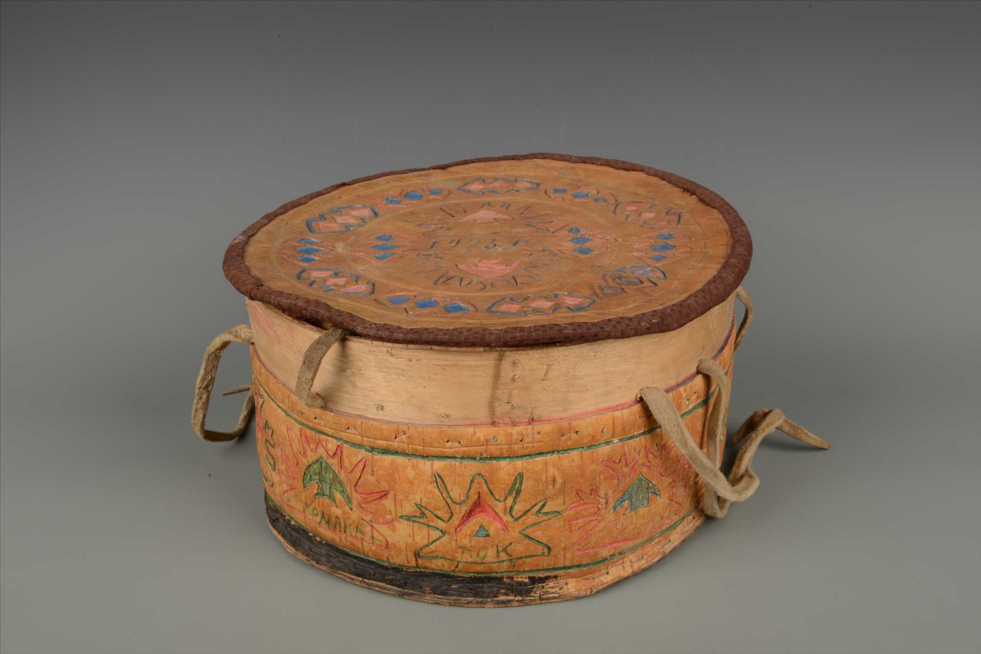 现代鄂温克族剔刻鹿头纹圆形桦皮盒