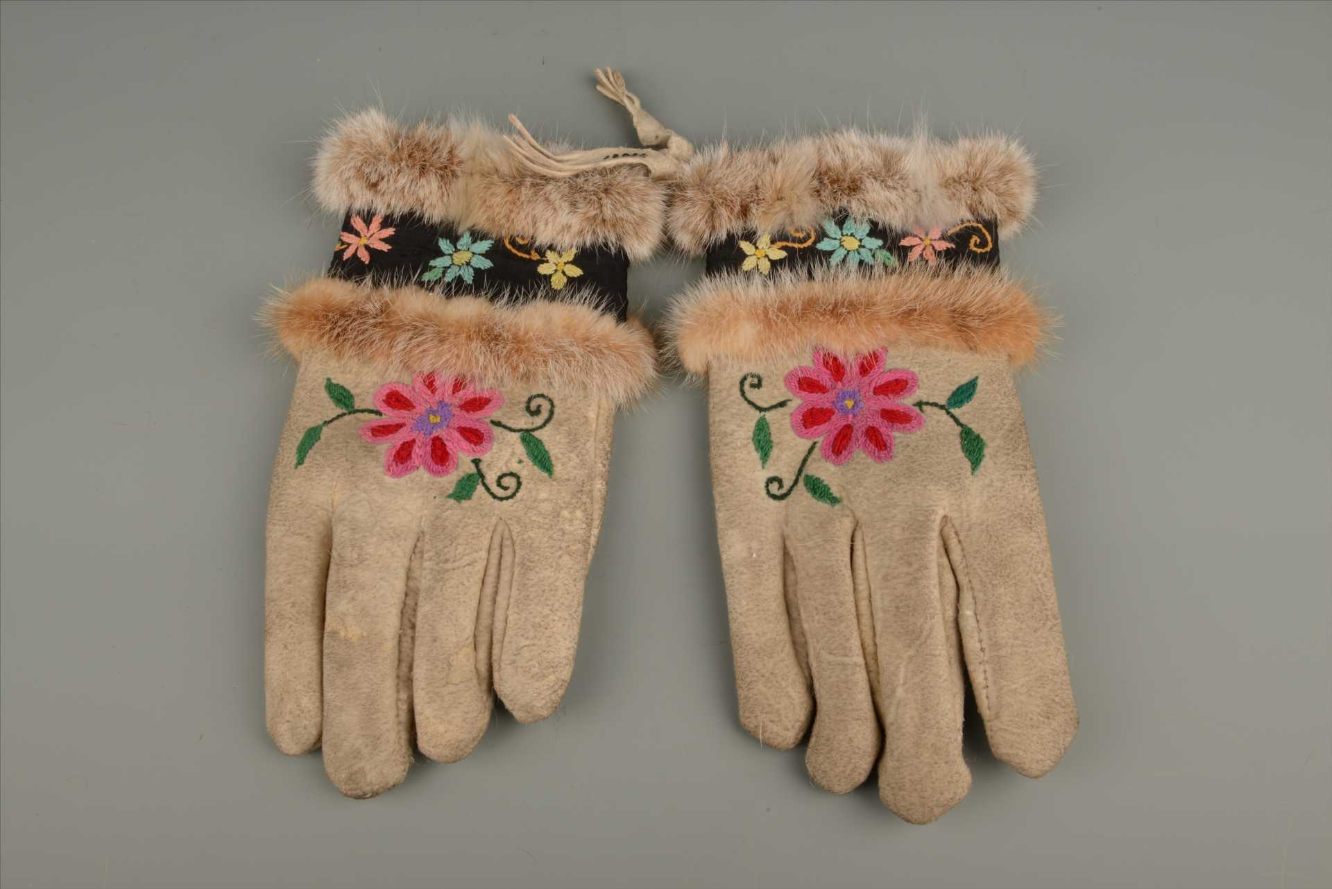 现代鄂温克族花草纹五指犴皮手套