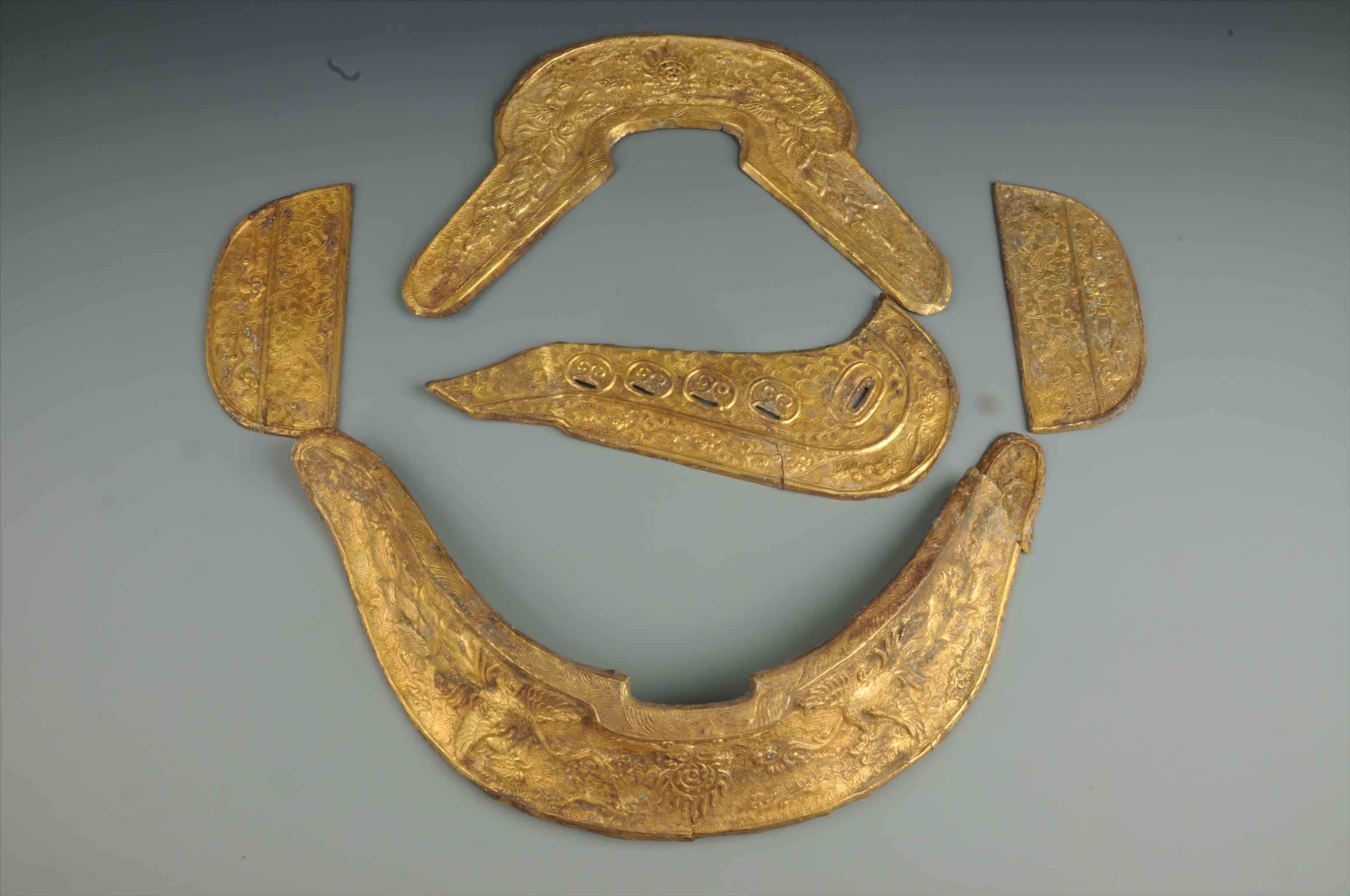 藏品尺寸:长:46.00 cm宽:24.00 cm高:0.50 cm前桥饰:长36cm宽24cm厚0.5cm;后桥饰:长46cm宽24cm厚0.5cm;肚带饰:长33.5cm宽14cm厚0.5cm;鞍桥腿饰:长18.9cm宽9cm厚0.5cm