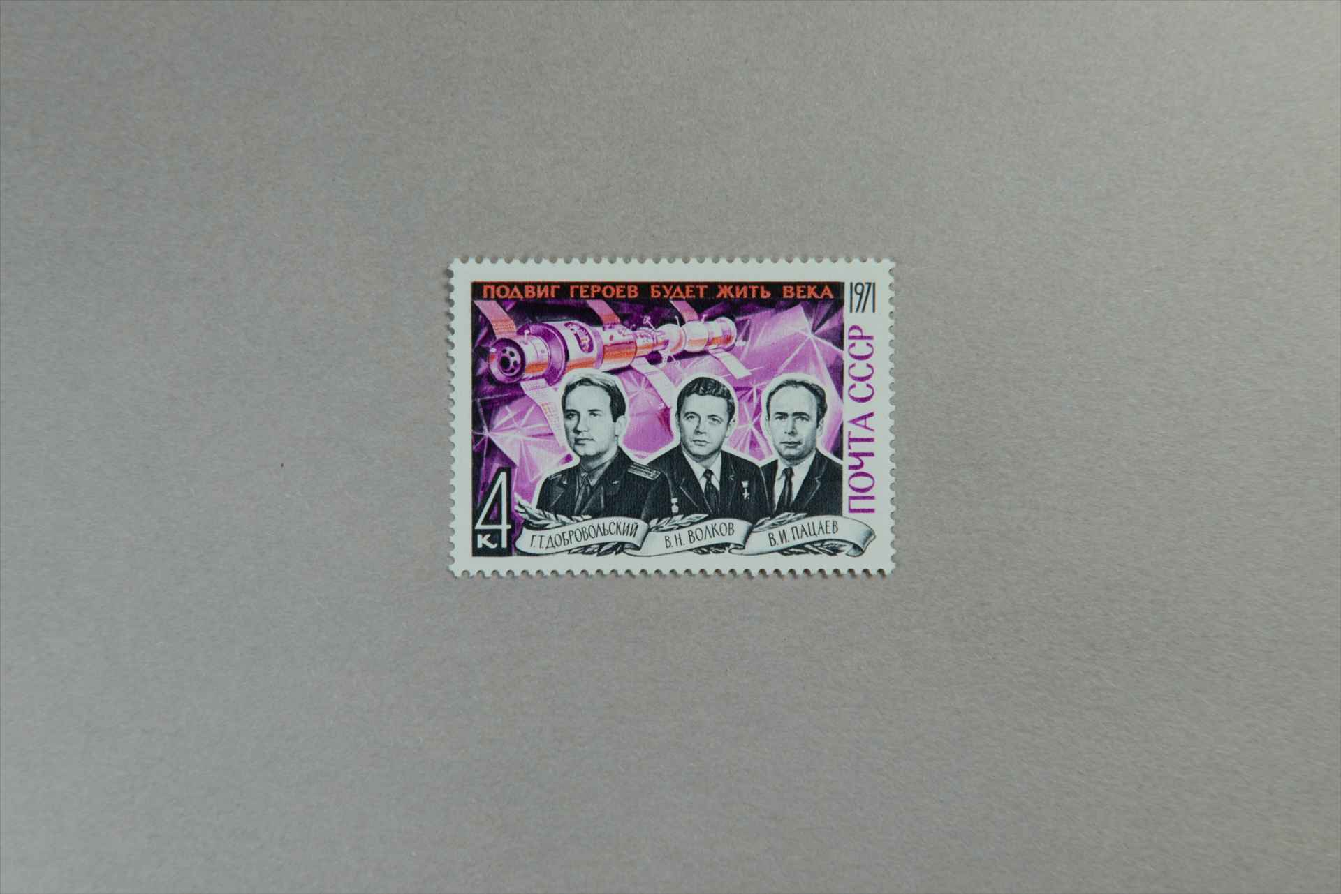 前苏联宇航员纪念录“联盟11”号宇宙飞船宇航员和工程师多勃罗沃尔斯基、沃尔科夫、帕察耶夫于1971年6月30日返回地球的航行中牺牲邮票