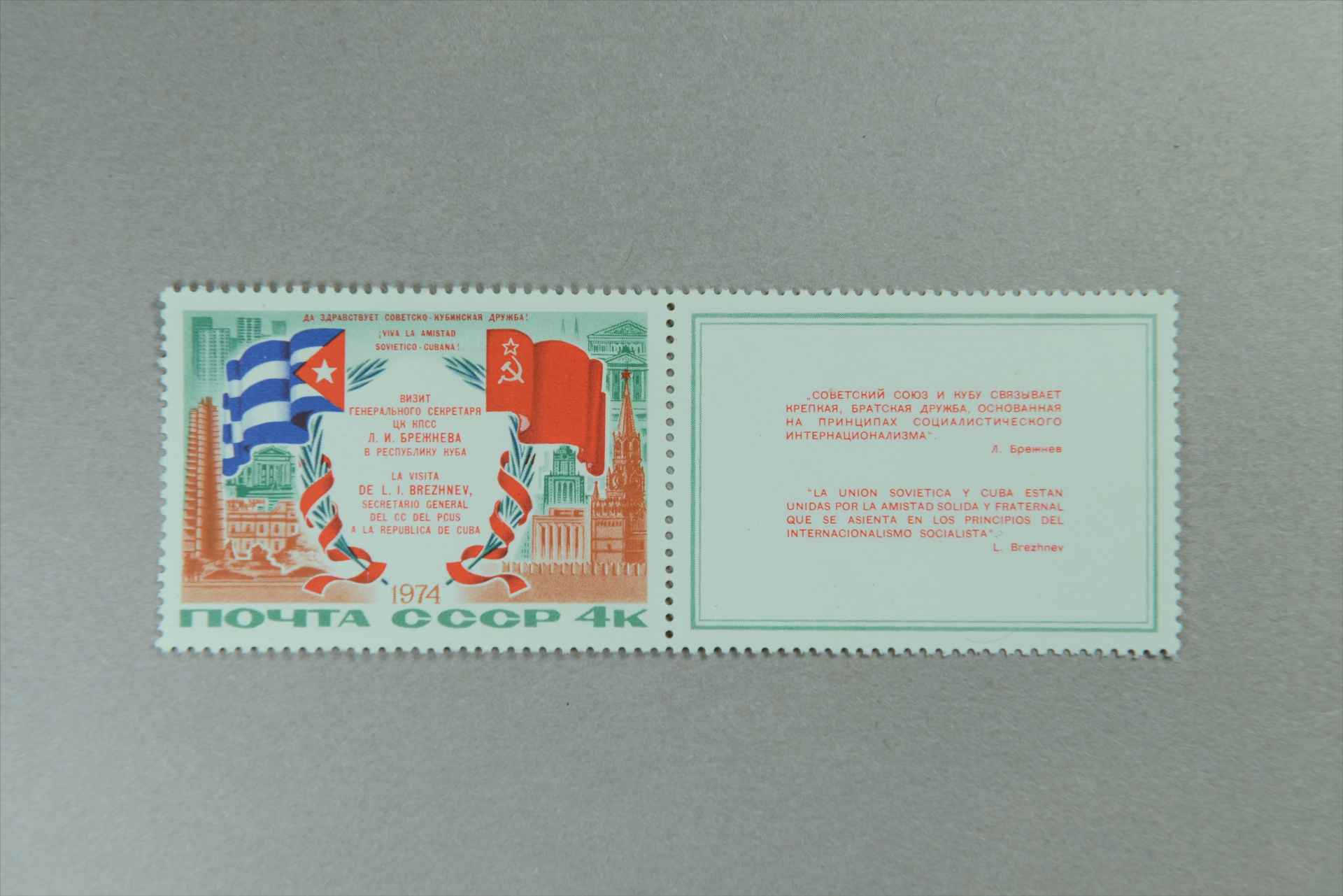前苏联苏共中央总书记勃列日涅夫访问古巴两国国旗和票证上的文字说明邮票