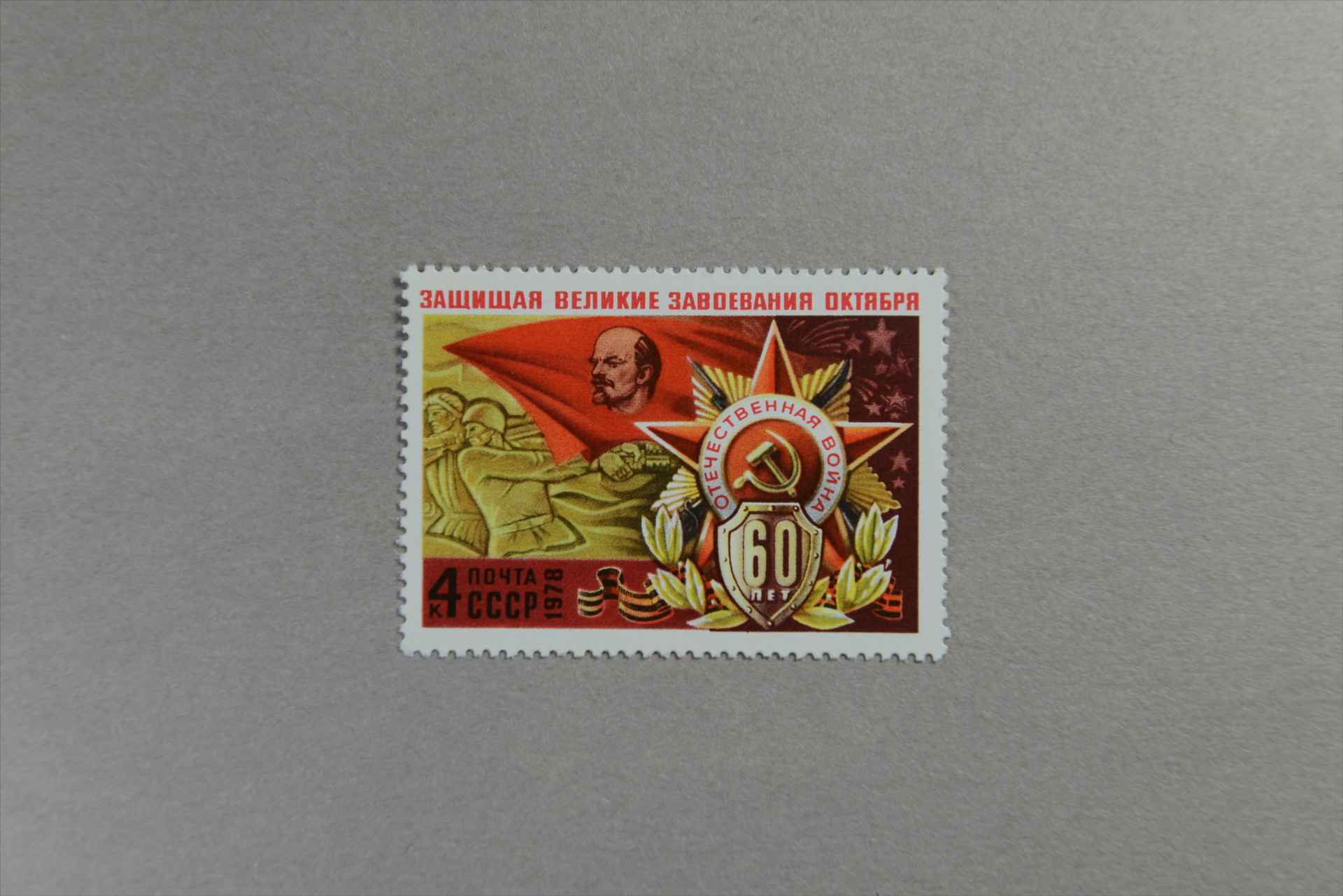 前苏联武装力量60周年红旗上的列宁像与卫国战争中的功勋邮票