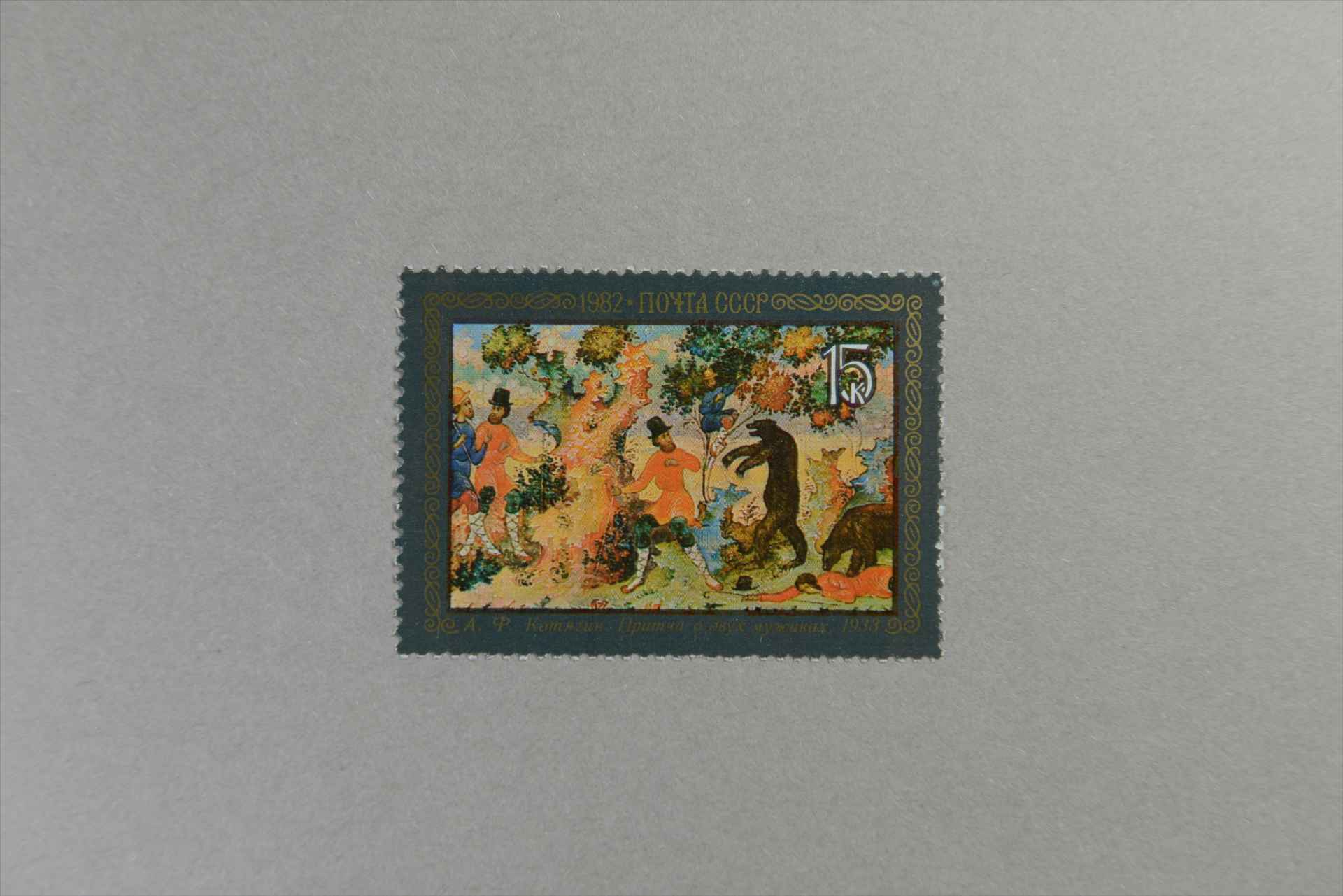 前苏联姆斯乔尔的民间工艺雕漆画阿·科佳金的寓言故事:《两个农夫》邮票