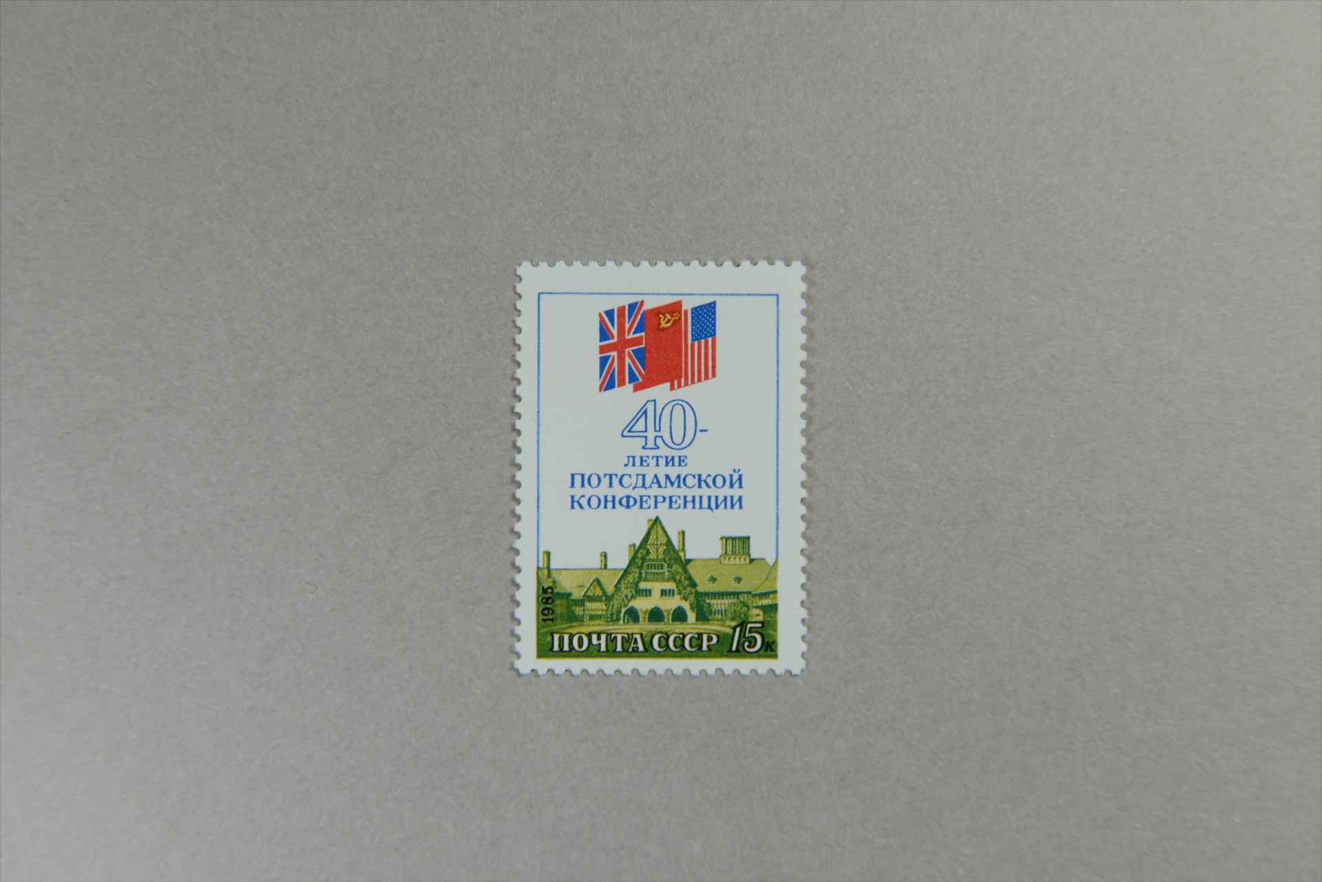 前苏联波茨坦会议40周年美国英国苏联的国旗和会址西席林霍夫宫前景邮票