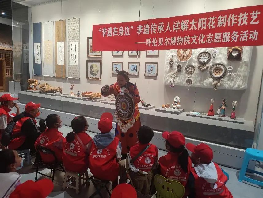2022年9月12日上午,呼伦贝尔历史博物馆联合呼伦贝尔新时代文明实践志愿服务协会共同开展了“非遗在身边”指尖盛开“太阳花”的文化志愿活动。呼伦贝尔历史博物馆社会教育部的讲解员向小朋友们讲解了非物质文化遗产的含义、标识及呼伦贝尔非物质文化遗产概况。此次文化志愿活动还邀请鄂温克族自治旗太阳姑娘工作室的艾吉玛老师,在“薪火相传——呼伦贝尔非物质文化遗产”展厅为小朋友们讲解鄂温克族非物质文化遗产项目希温・乌娜吉(太阳花)缝制过程和制作技艺等,并讲述其文化内涵与文化价值。