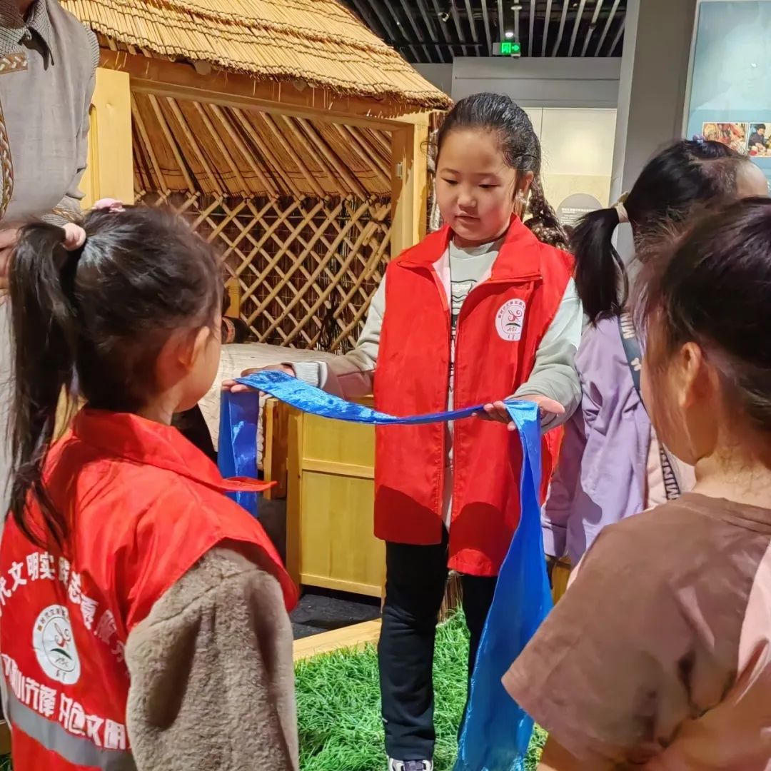 在博物馆社教老师的带领下,小朋友们认真倾听中国非物质文化遗产标识的含义、了解呼伦贝尔各民族非物质文化遗产项目的发展现状,积极参与体验蒙古民族敬献哈达的礼节、在蒙古包内做客的角色互动扮演,以及亲身感受达斡尔族的扳棍比赛等等。在寓教于乐的活动中,小朋友们深切感受着家乡悠久灿烂的民族文化,学在其中,乐在其中,既习得了社科知识,又体验到了传统文化的乐趣,对自己感兴趣的话题主动提问,社教老师细致解答,活动现场气氛热烈。通过活动,小朋友们在博物馆“沉浸式”学习社会科学知识,激发并增进他们对家乡传统文化和非物质文化遗产项目的热爱。