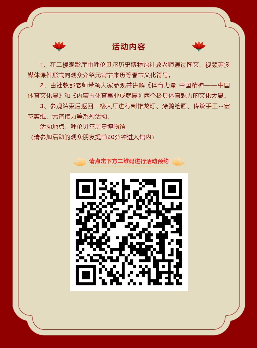 辞旧鞭炮催春潮,迎新锣鼓闹元宵。值此十四冬盛大开幕之际,以正月十五团圆日为契机,为了弘扬我国彩灯文化传统,丰富广大市民的精神生活,呼伦贝尔博物院于2024年2月24日(正月十五)晚18:00-20:00在呼伦贝尔历史博物馆开展《欢乐十四冬 正月十五月正圆》博物馆奇妙夜系列活动。